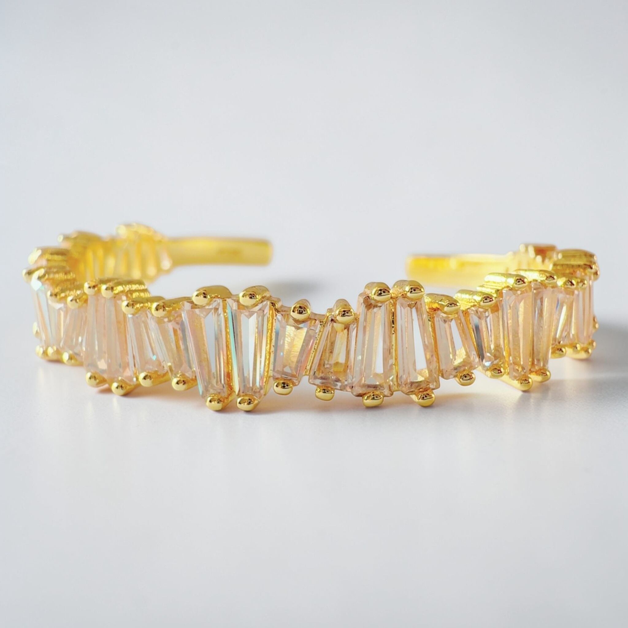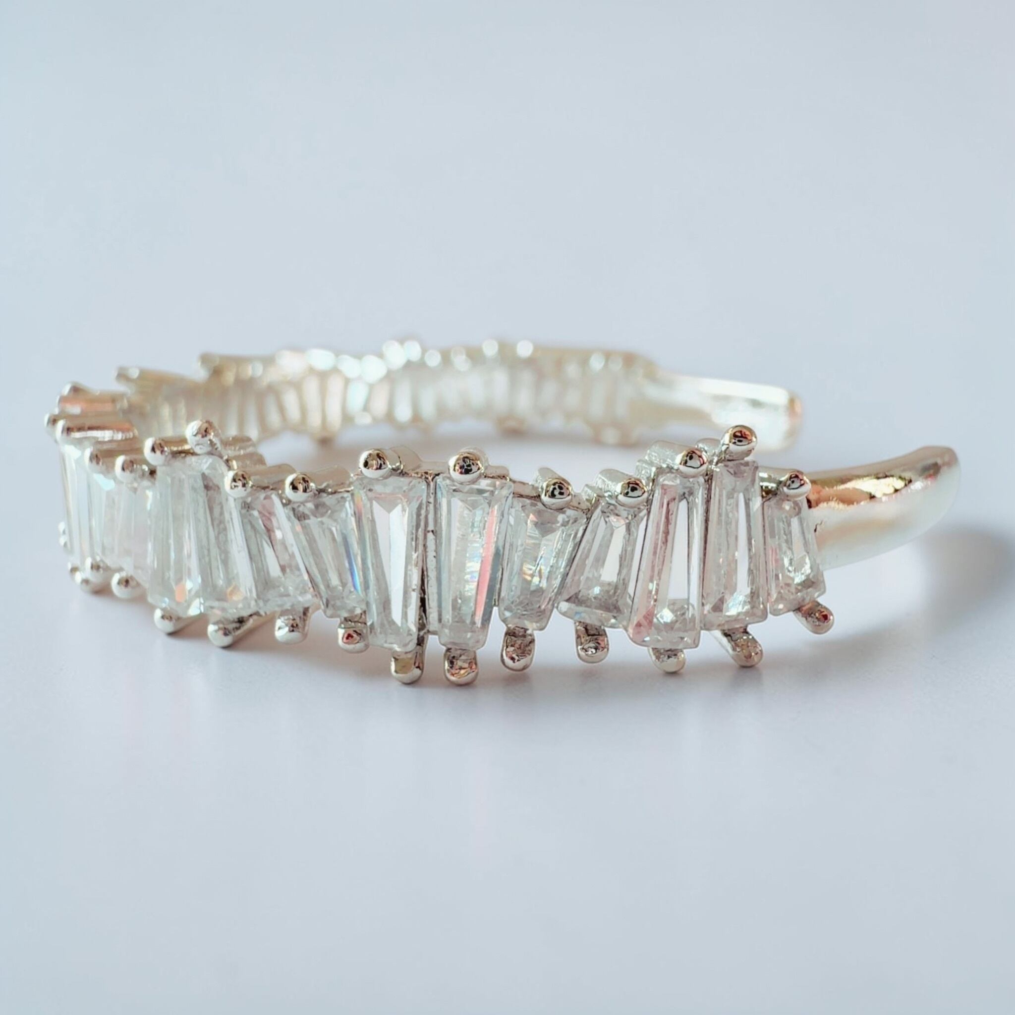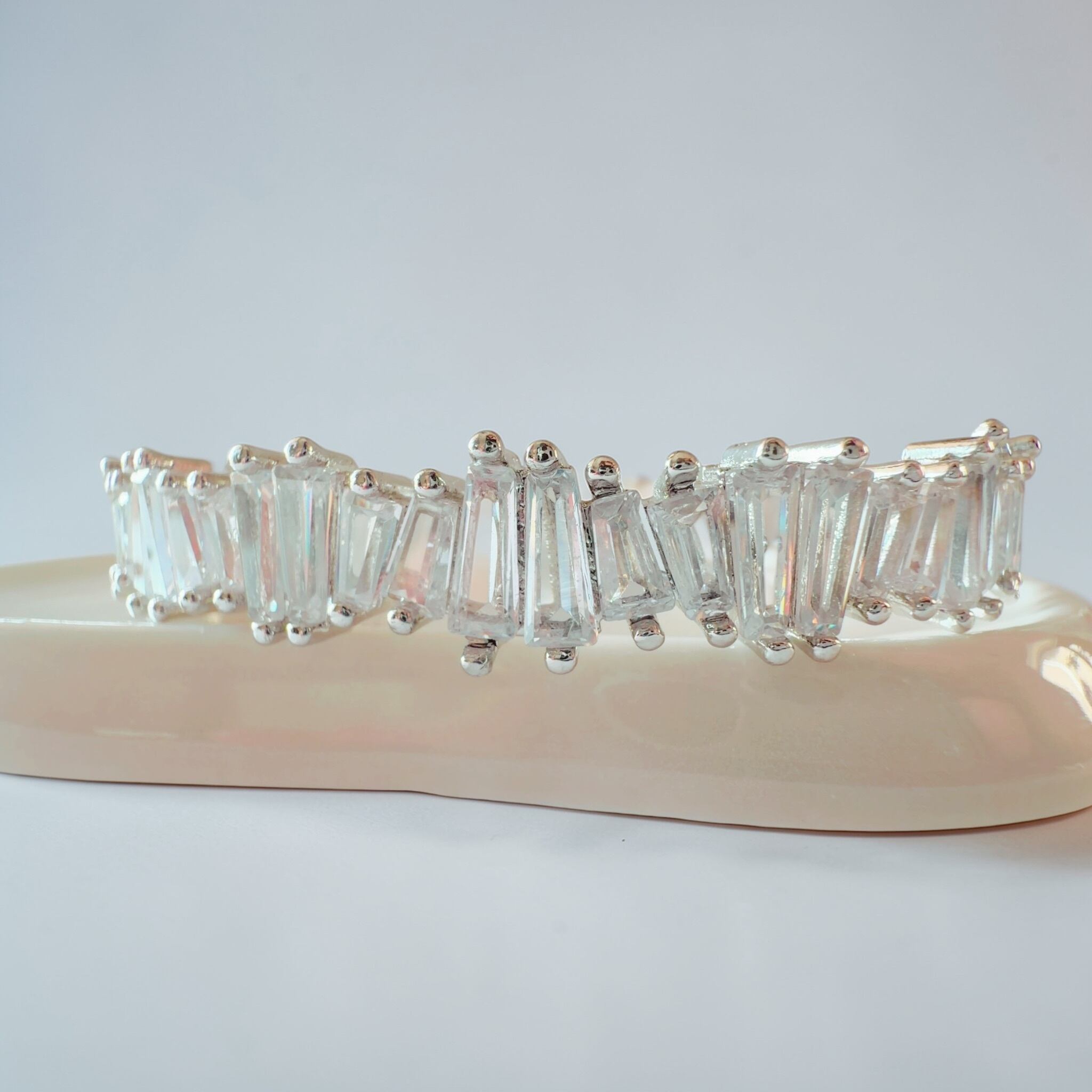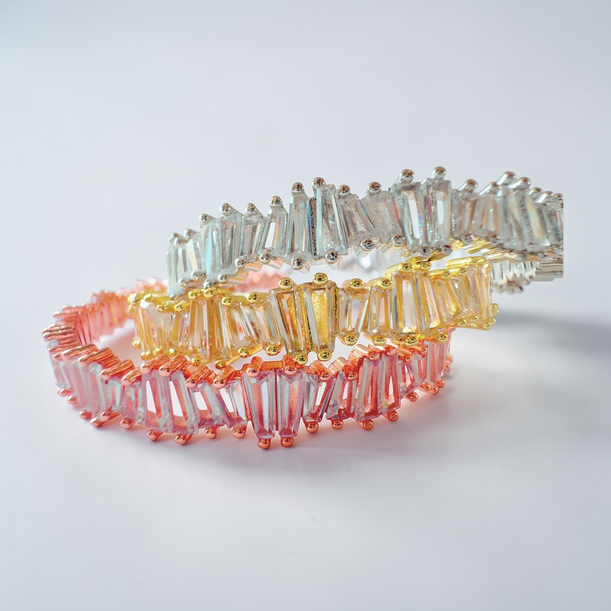 従来のバングルが持つ華やかさを受け継ぎながら、silverを用い、今回は縦ラインを意識したストーンへと変えることで、光の反射をより強く、美しく感じていただける仕上がりとなりました。