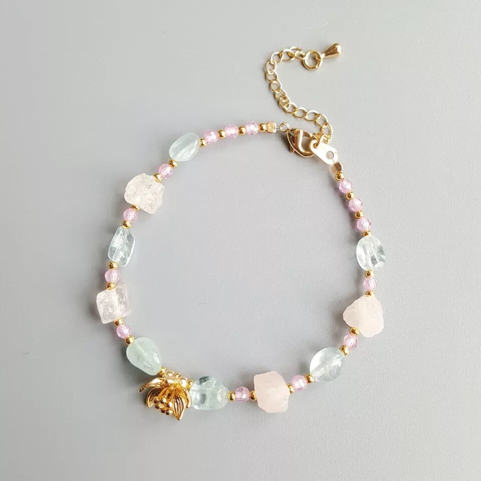 お花をモチーフに、ナチュラルなローズクォーツとアクアマリンのストーンを配置し淡く輝くブレスレットに仕上げました。