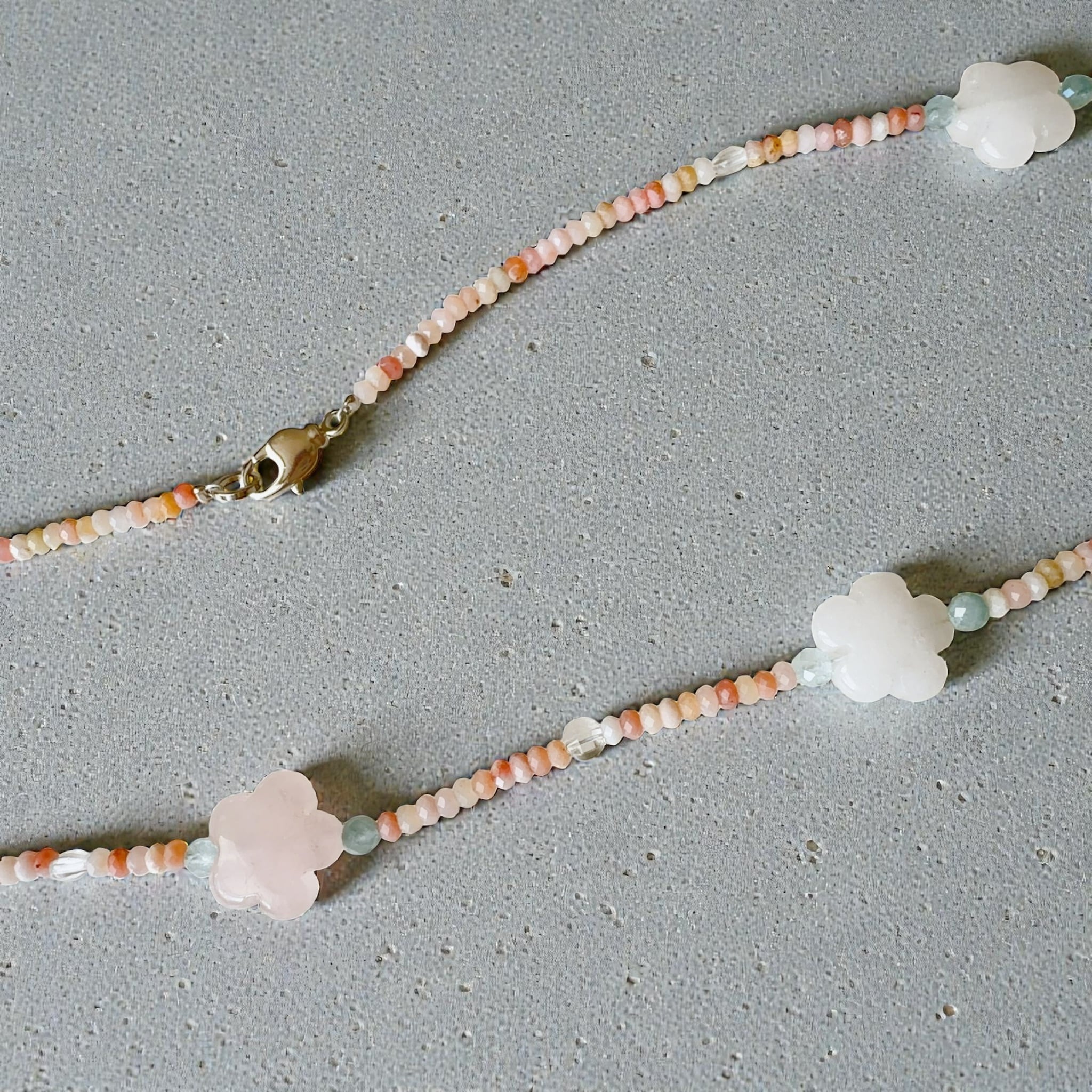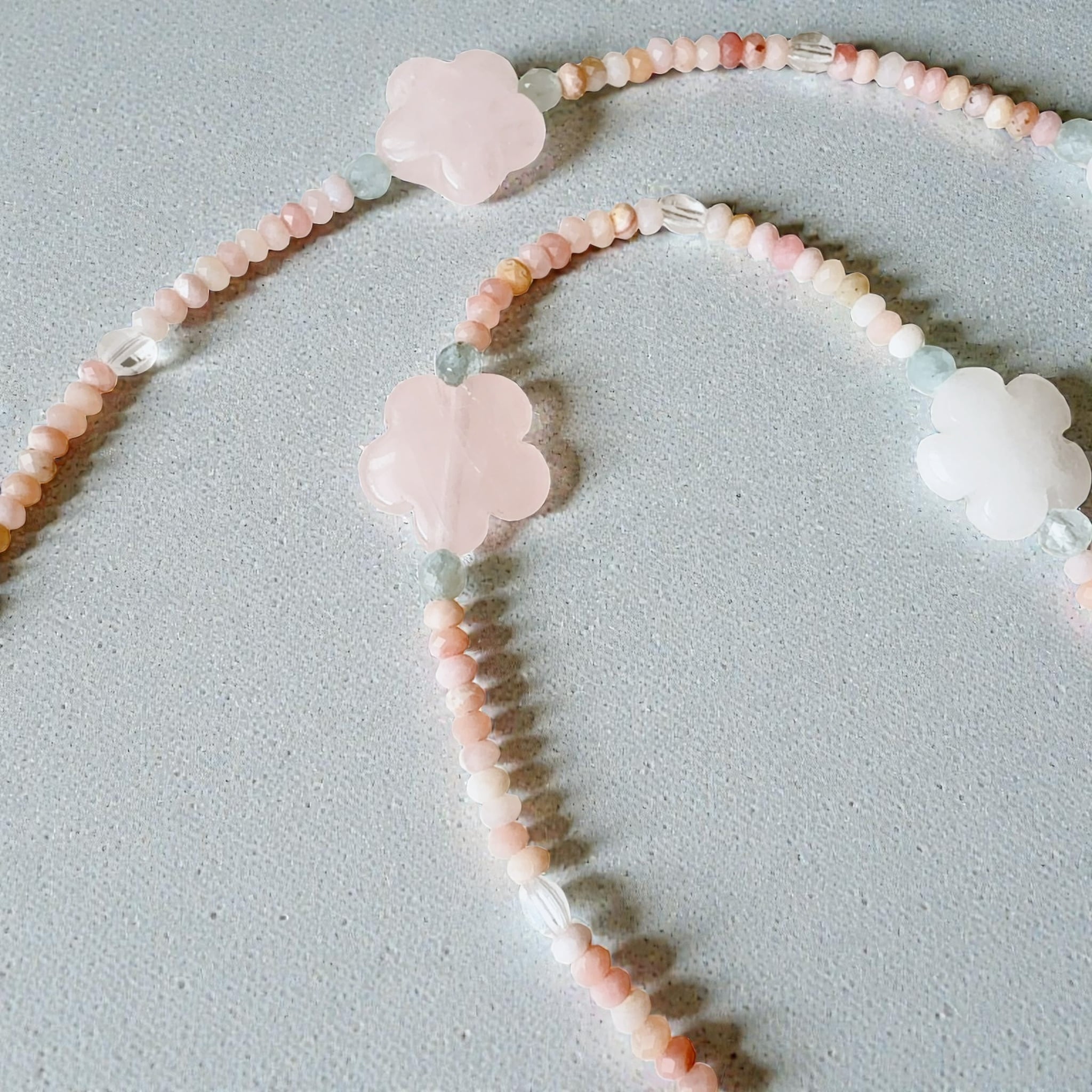 M546 叶花輪 チャンスをに手にする「強運・開運」 幸運を逃さず運をつかむ パステルマルチカラー パワーストーン フラワー ロング ネックレス ローズクォーツ 水晶 ピンクオパール アクアマリン 天然石 酉の市 強運 開運 運気アップ くじ運 ラッキー 臨時収入