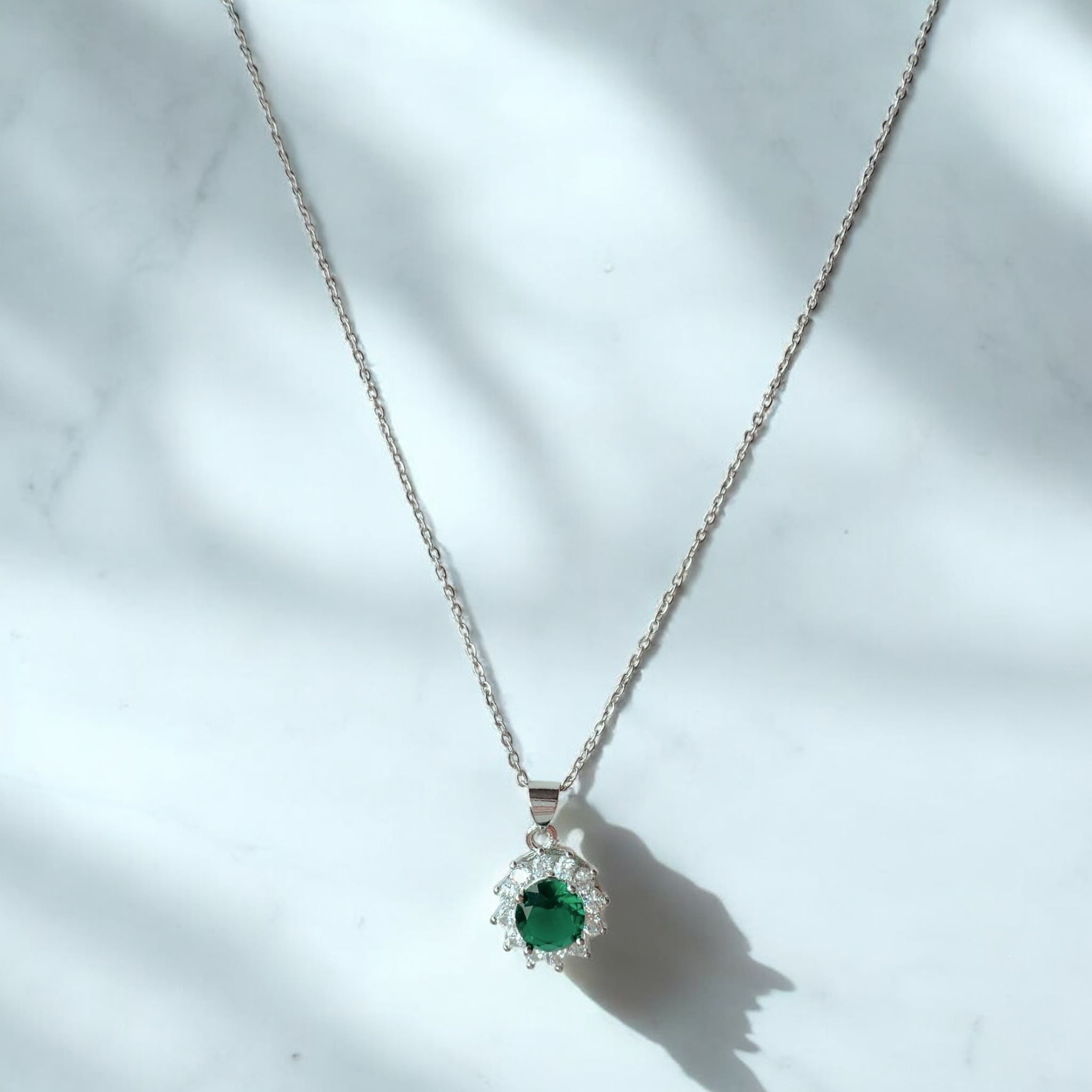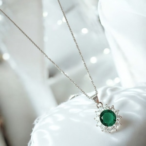 グリーンが鮮やかで美しい大粒のラボエメラルドの周囲には七色にきらめく美しいモアサナイトのストーンを配置し、どこから見ても見入ってしまうほど美しいネックレスに仕上げました。