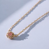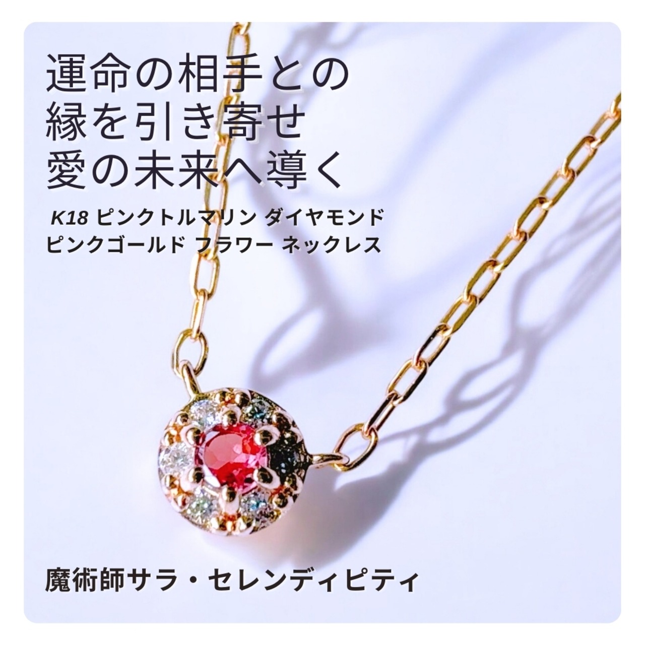 チェリーピンクが美しいピンクトルマリンを中央に配置し、ダイヤモンドが花びらの方に配置された可愛らしいデザインのネックレスは、縁結びに特化した魔術をセットしています。