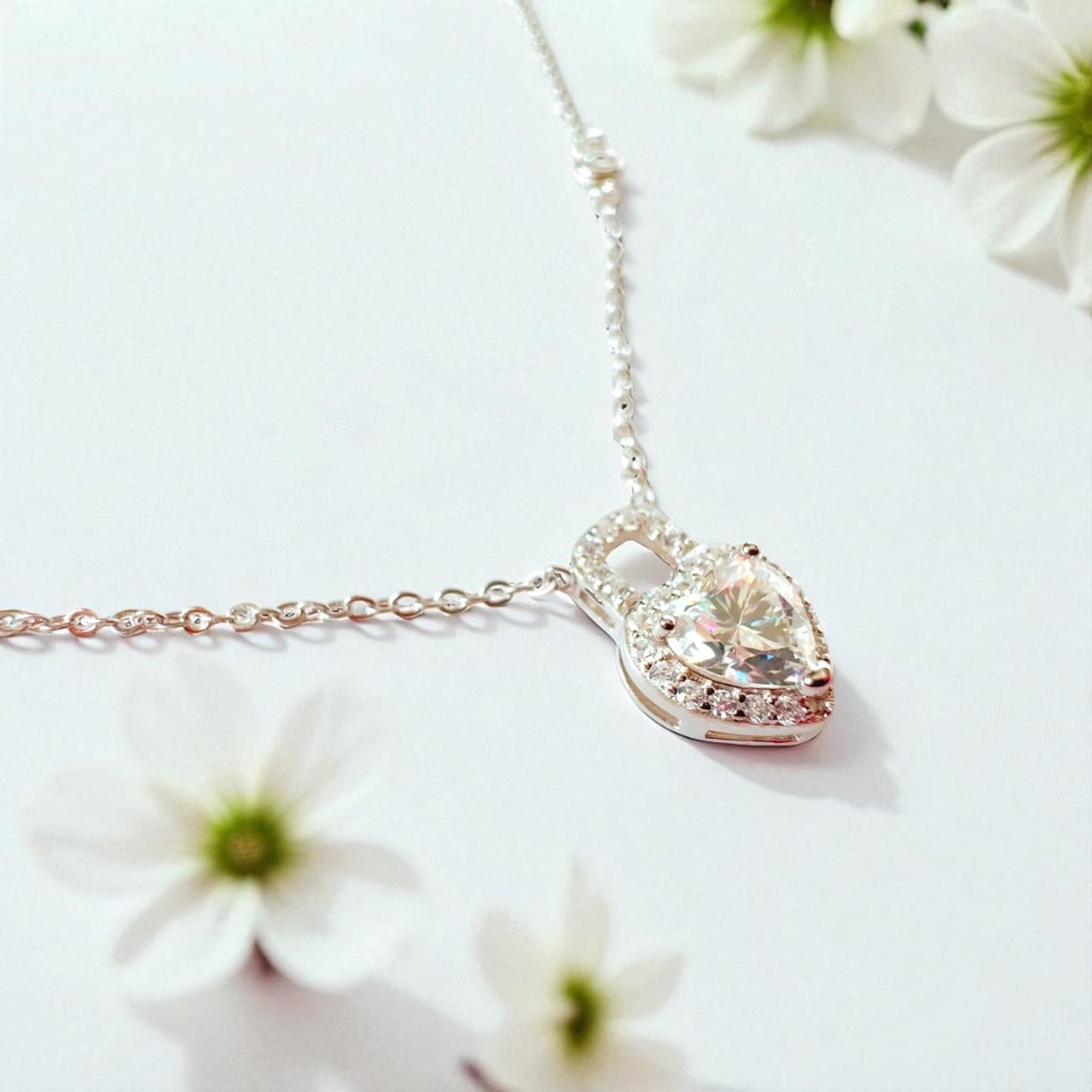 ハートシェイプのモアサナイトは、まるで宝物のようにその中に封じ込められ、身に着ける人の魅力と存在感を最大限に引き出します。