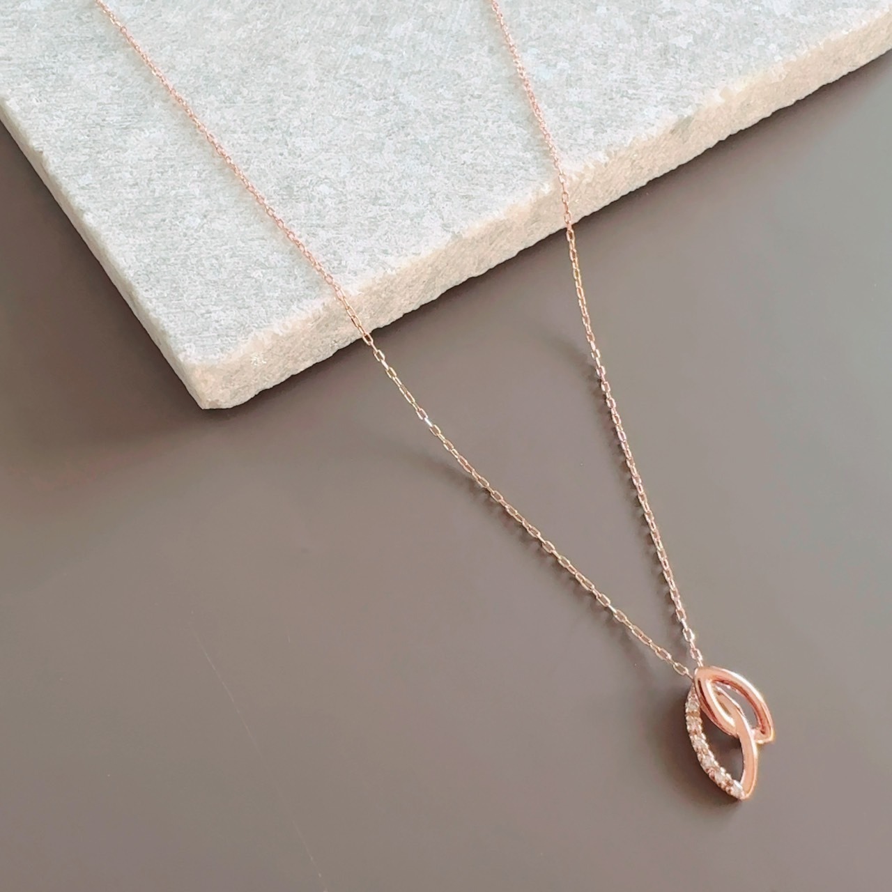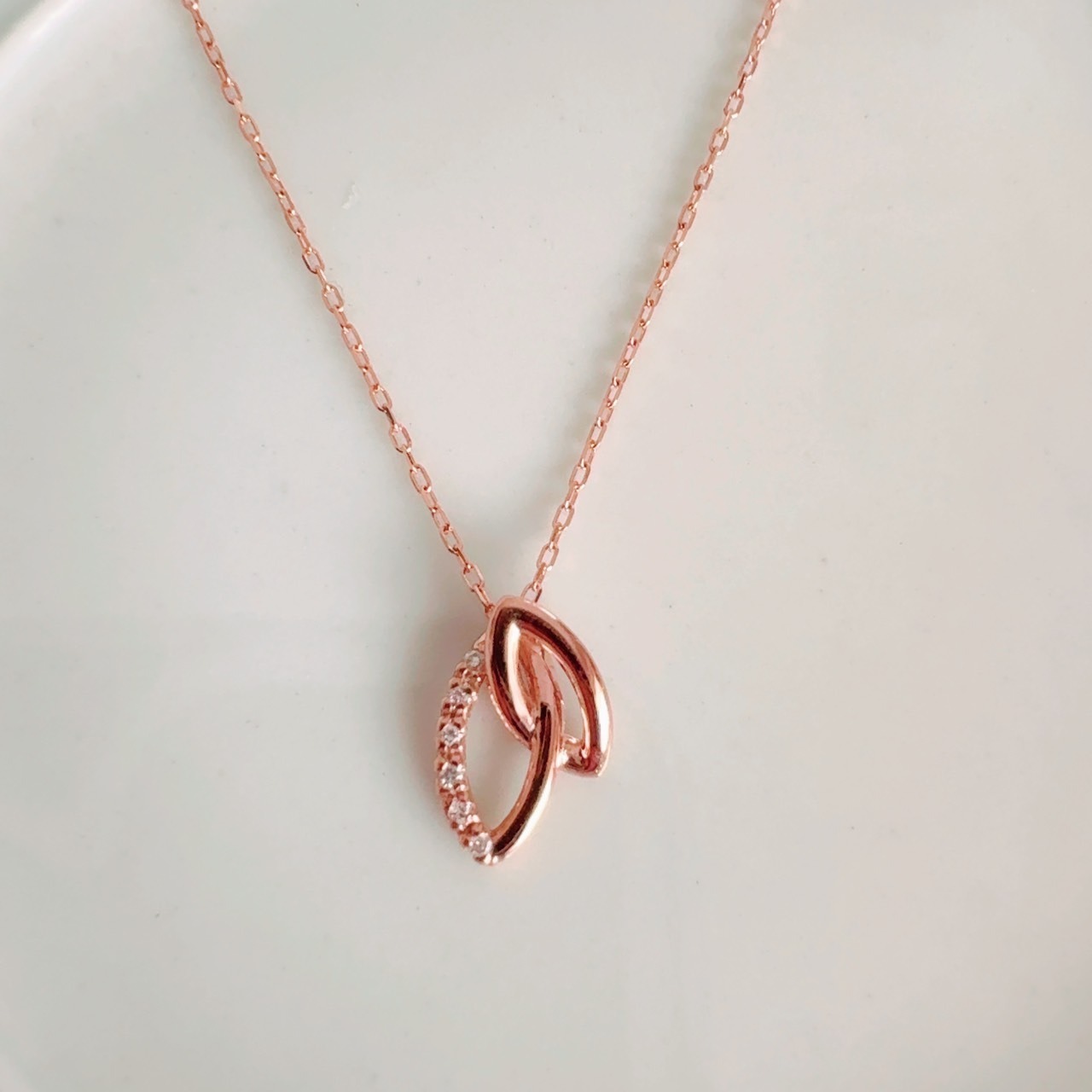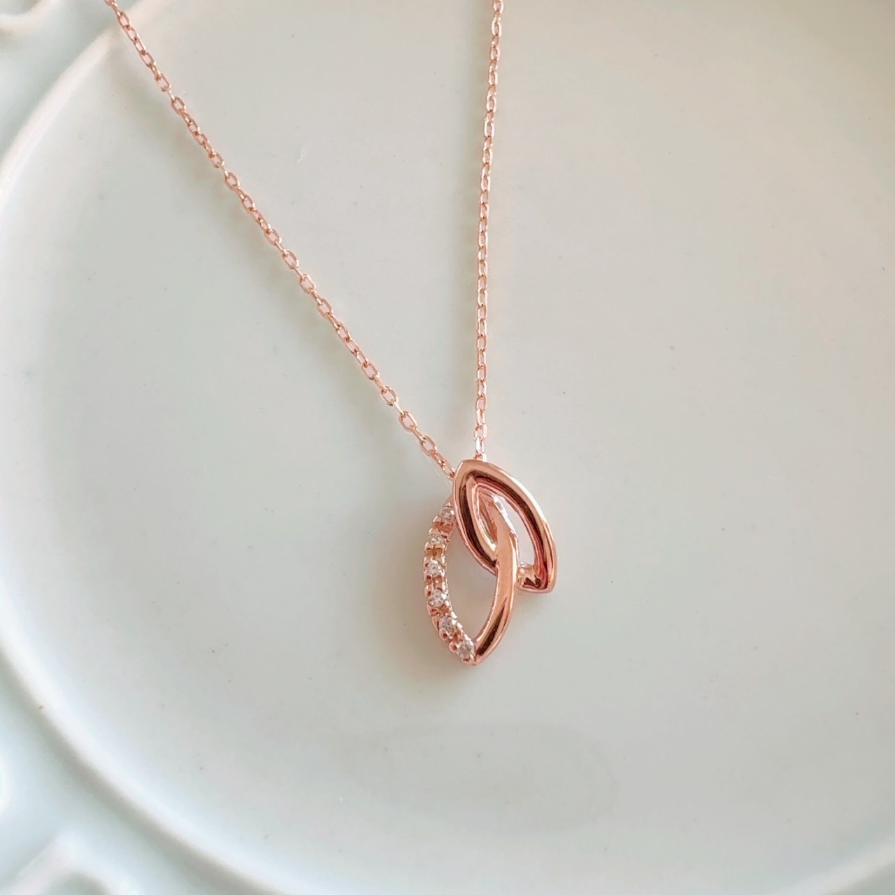 煌めくダイヤモンドを配置した美しきダブルリーフペンダントには、2つの心を1つ重ね手に入れる、強いエネルギーが込められています。