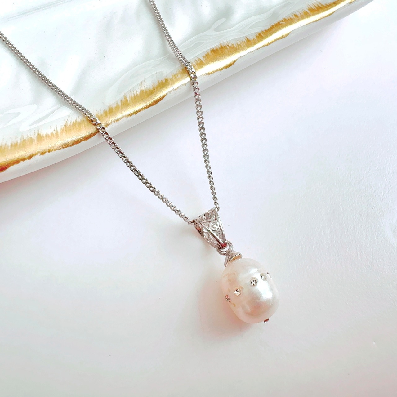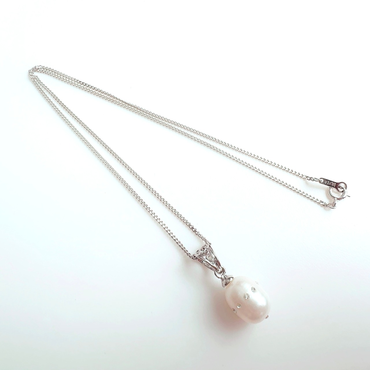 天然のパールの艶が美しい大粒のパールにマチュラダイヤモンドをセッティングし、胸元を彩ります。