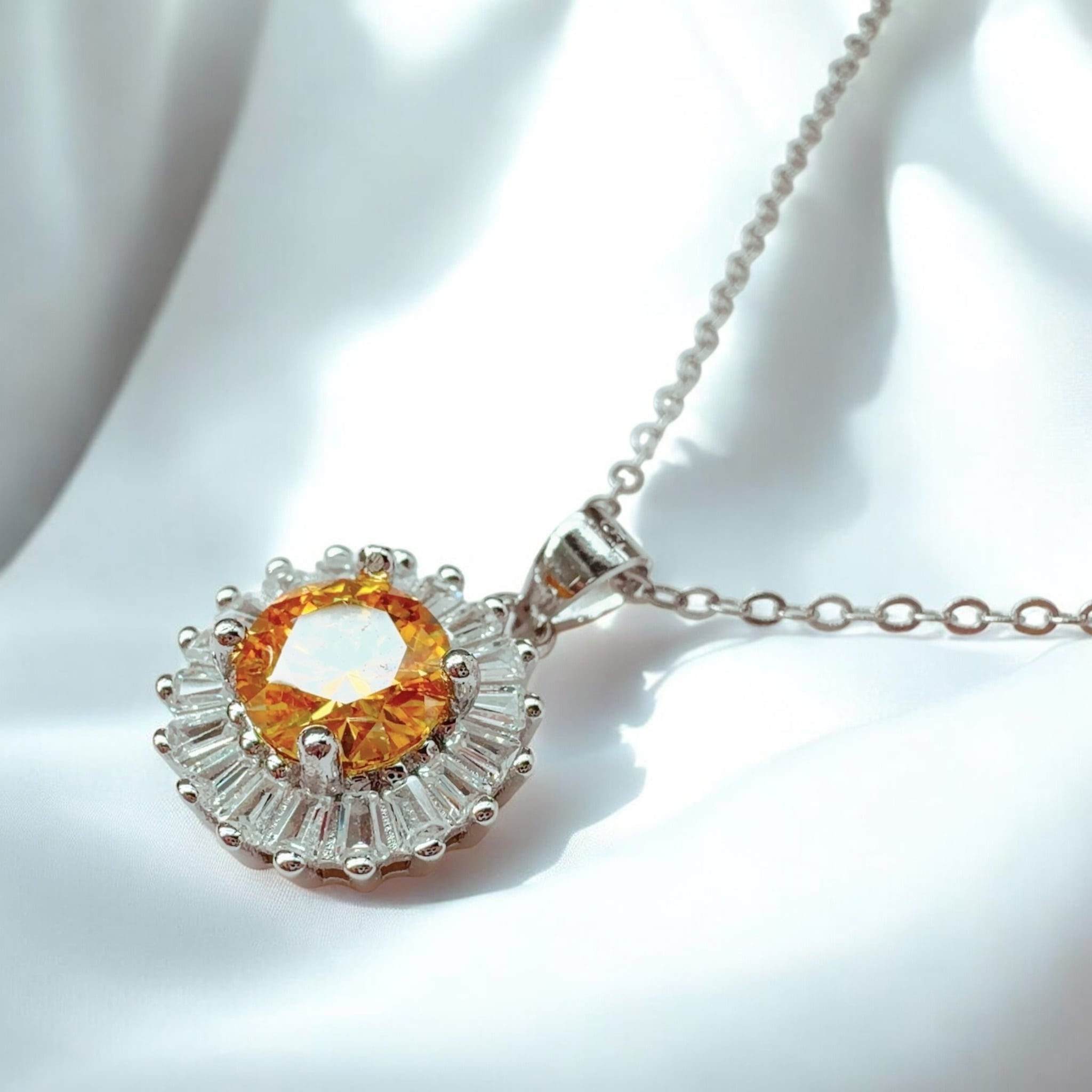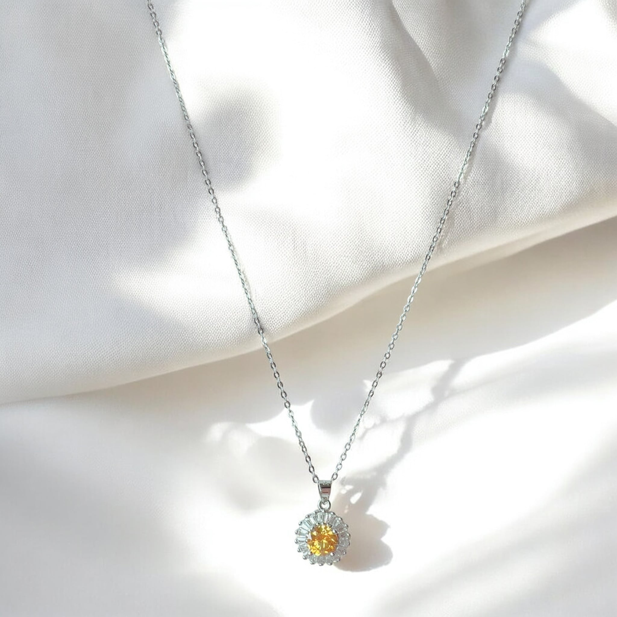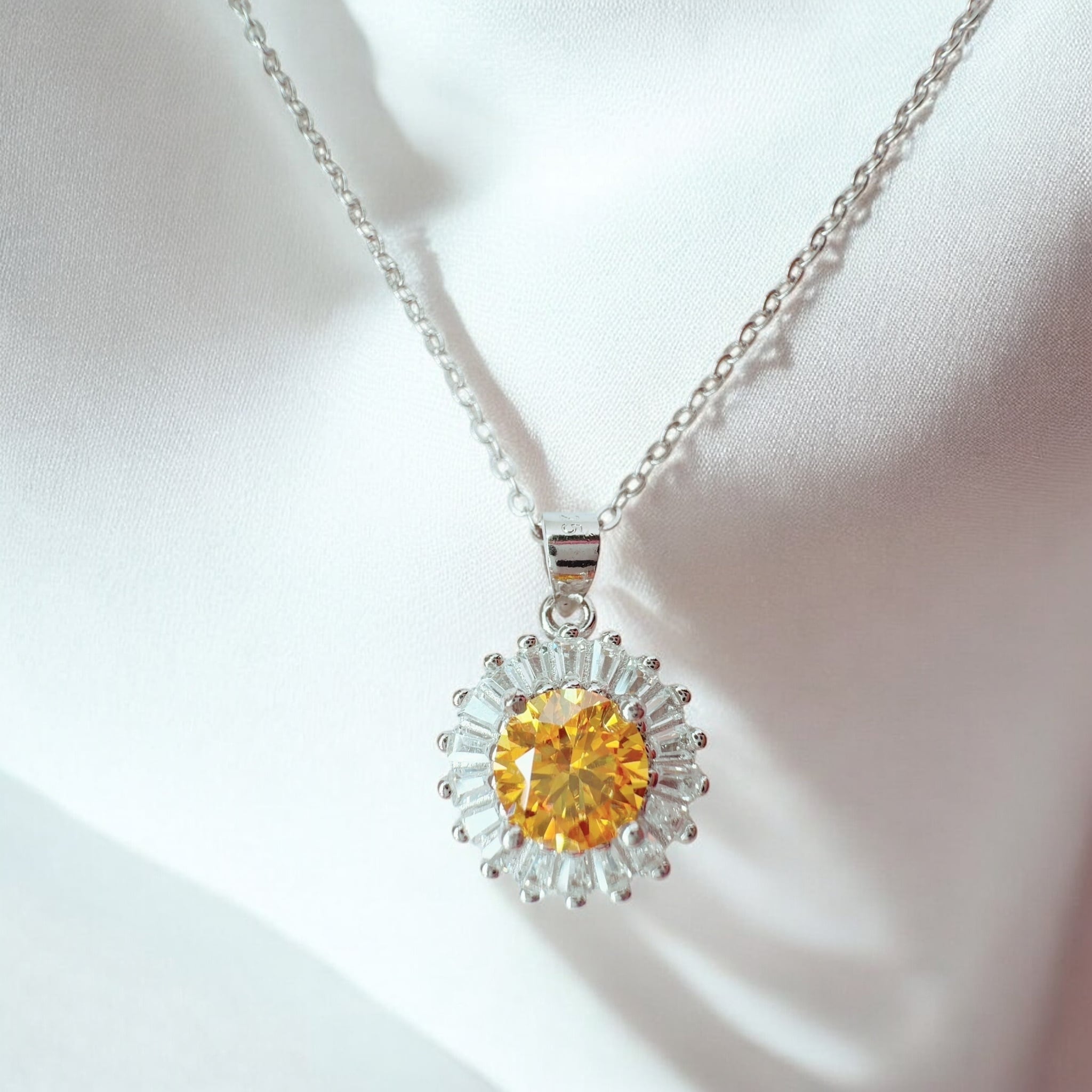 太陽のようにまばゆい輝きを放つ、イエローモアサナイトを大輪の花に見立てた特別なネックレスです。